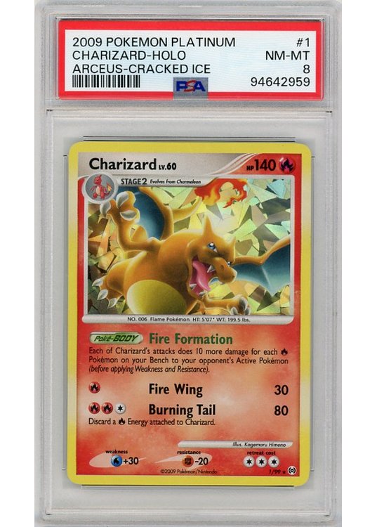 Charizard – Cracked Ice Holo – 1/99 – PSA 8 fra PL Arceus serien.