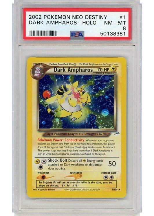Du køber her Dark Ampharos – 1/105 – PSA 8 fra Neo Destiny serien.
