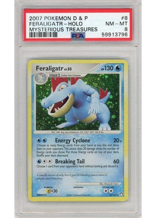 Du køber her Feraligatr – 8/123 – PSA 8 fra D&P Mysterious Treasures serien.