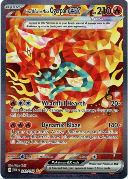 Du køber her Hearthflame Mask Ogerpon ex – 212/167 fra SV06 Twilight Masquerade serien.
