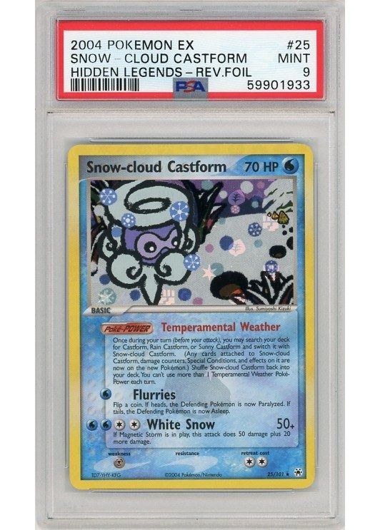 Du køber her Snow-Cloud Castform – 25/101 – Reverse Foil – PSA 9 fra EX Hidden Legends serien.