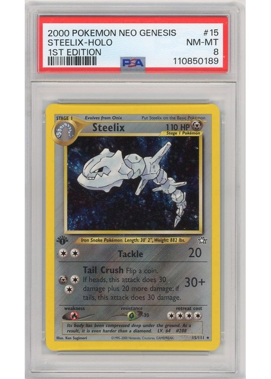 Du køber her Steelix – 15/111 – 1st Edition – PSA 8 fra Neo Genesis serien.