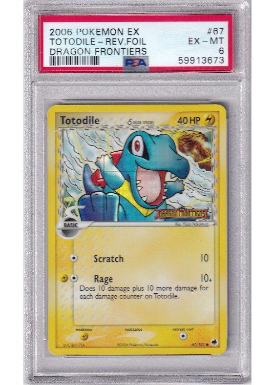 Du køber her Totodile δ – 67/101 – Reverse Foil – PSA 6 fra EX Dragon Frontiers serien.